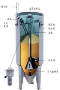 工作原理:活性砂過濾器基于逆流原理,待處理的原水通過進水管進入過濾器內(nèi)部,經(jīng)底部布水器均勻分配后向上逆流通過濾床,過濾后的濾液在過濾器頂部匯集后溢流排出過濾器系統(tǒng)。在空壓機的作用下,空氣提升泵將過濾器底層被污染的臟砂提升至過濾器頂部的洗砂器中,通過水流的紊流作用將砂表面的污染物分離出。清洗后的凈砂利用自重返回到砂床中,而清洗砂所產(chǎn)生的污水從過濾器的排污口排出。