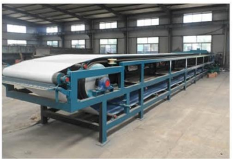 6、膠帶裙邊及擋板:采用EP200 四層聚酯布的環形橡膠帶,膠帶裙邊采用組合結構即波形裙邊與平行膠帶粘合而成,這種結構裙邊伸縮性好,可避免裙邊經過輥筒改向破裂,可防止料液從兩側流出。橡膠帶的上部構造為中間一排排水溝槽,溝槽中間鉆有真空排液孔,鉆空部位為純橡膠無布層,可防止液體通過布層纖維進入橡膠層導致膠帶分層,大大的延長了橡膠帶的使用壽命。