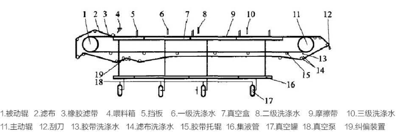 該設備采用了固定真空盒,膠帶在真空盒上滑動,真空盒與膠帶間構成運動密封的結構型式。以濾布為介質,使料漿水平布置于過濾介質之上,充分利用料漿重力和真空吸力實現固液分離。它能連續自動完成過濾、濾餅洗滌、卸渣、濾布沖洗等工藝操作,并且母液、濾餅洗滌液可以分段收集。