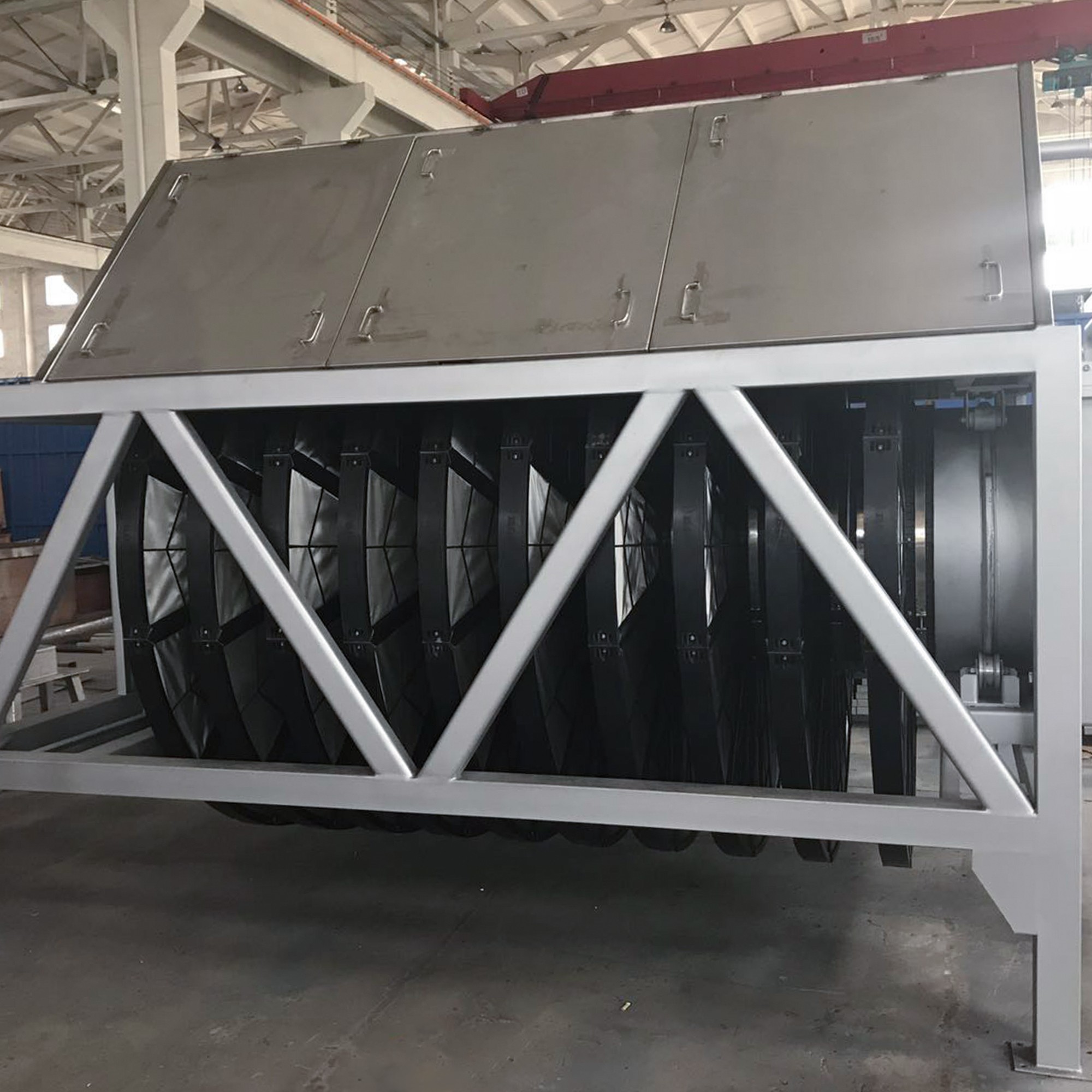 濾布濾池:該系統包括混泥土池體、進水堰箱、出水可調堰板、支撐軸座、中空設備主體(等邊六角形或者圓形)、纖維濾盤、支撐滑輪、出水口密封組件、排污系統、驅動裝置、自動化控制系統。設備主體端部與支撐軸座法蘭連接,出水管置于支撐滑輪上,并安裝出水密封組件;纖維濾盤垂直安裝在設備主體上;濾盤內部設有骨架,用于支撐包裹在外面的濾布,骨架中空,并與設備主體連接固定后形成一個外部密封,內部中空的整體;排污系統包括池底排污和濾盤反洗,每個濾盤的兩側設有反抽吸裝置。運行時,污水經過進水堰箱,均勻進入濾池,由外向內通過濾盤,由濾盤上的濾布截留污物后的凈水進入中空設備主體,然后排出池外。